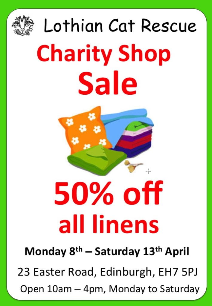Half price charity shop sale Start date: April 8, 2019End date: April 13, 2019Time: 12:00 am - 12:00 amLocation: 23 Easter Road, Edinburgh, EH7 5PJ